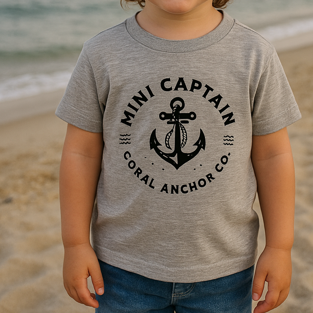 Let your little one lead the crew in our Mini Captain Youth T-Shirt! Designed for coastal kids with big personalities, this soft heather grey tee features a bold black anchor graphic and nautical lettering that proudly reads βMini Captain β Coral Anchor Co.β